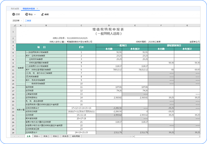 • 支持最新政策税务报表,自动出具增值税、企业所得税、印花税、附加税等纳税申报表。