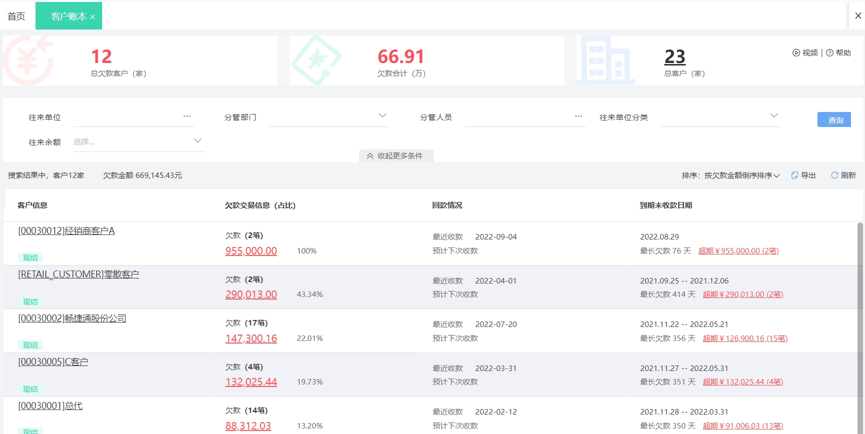 同时还能按业务员、客户等多维度查看客户应收欠款。