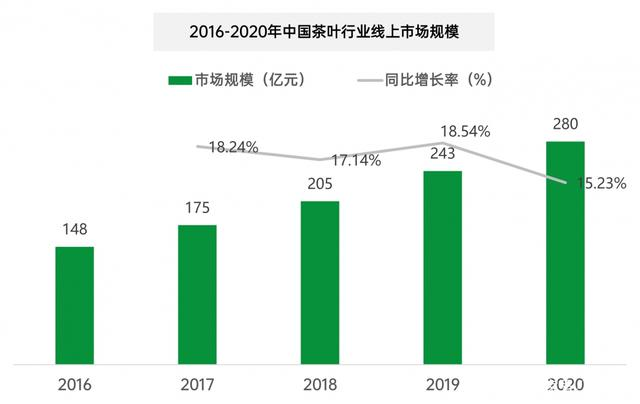 2016年至2020年,中国茶叶线上市场规模一直呈稳步增长态势,2016年为148亿元;2017年175亿元,同比增长18.24%;2018年为205亿元,同比增长17.14%;2019年为243亿元,同比增长18.54%;