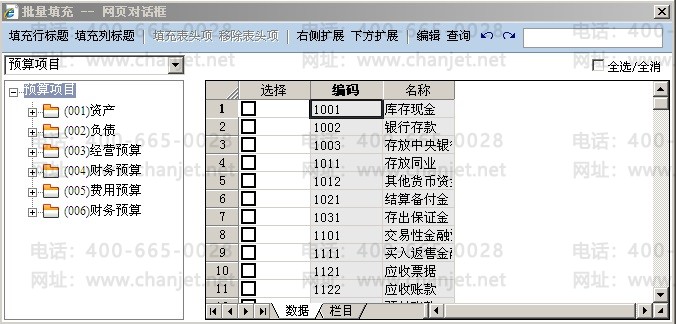 3. 如果希望在行区域上填充预算表构成数据,则在预算表格式显示界面中选中要填充的区域,在图 5-7-3-2 界面中左侧下拉选择要填充的内容类别,在右侧选择要填充的具体数据,然后点击〖填充行标题〗并确定是直接填充、插入行、追加行,系统自动填充到格式显示界面中。