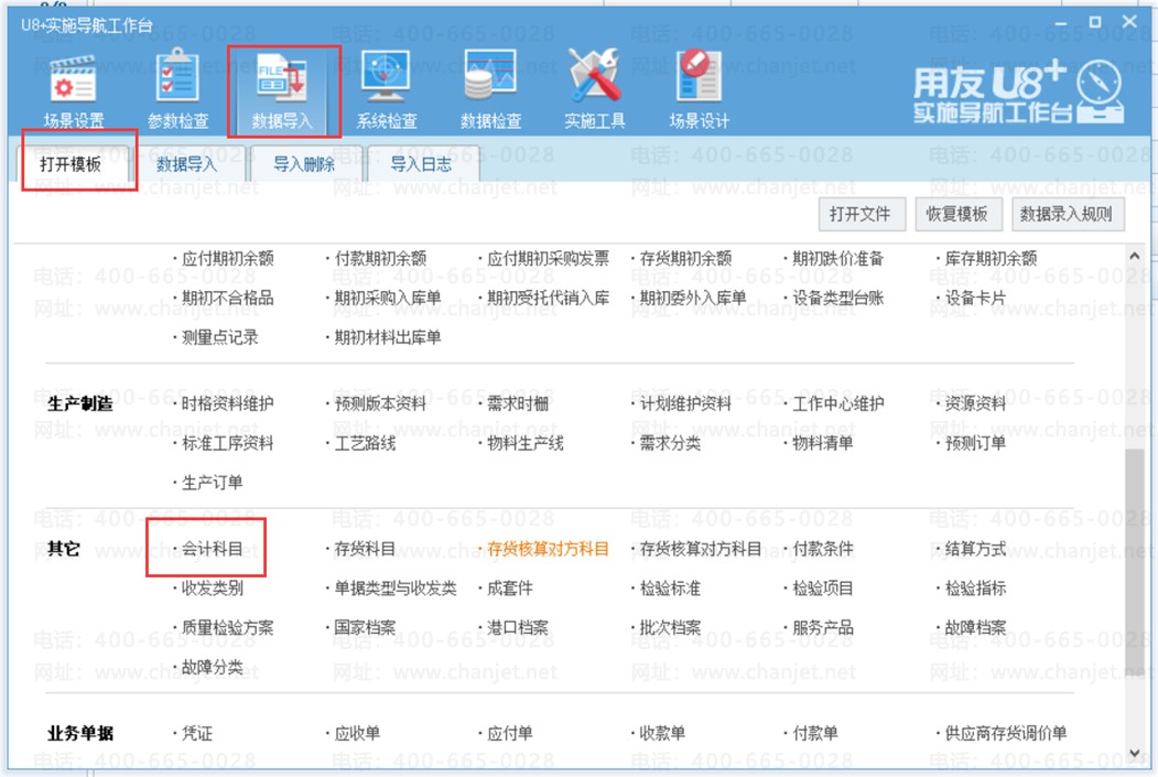 1.从实施导航里的数据导入-打开模板中点会计科目,打开模板。