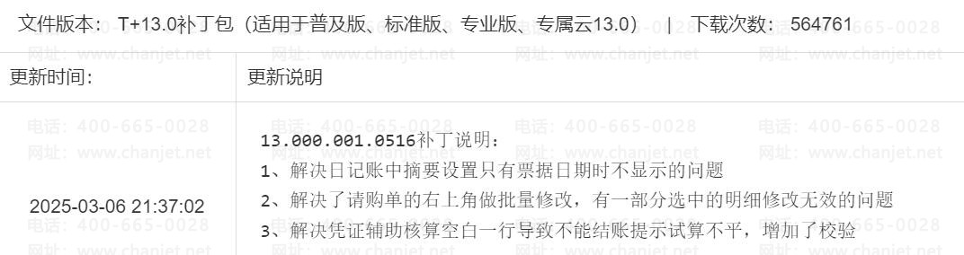 用友畅捷通T+13.0官方在2025-03-06发布的相关的补丁,有此问题的朋友们可以直接下载更新补丁!