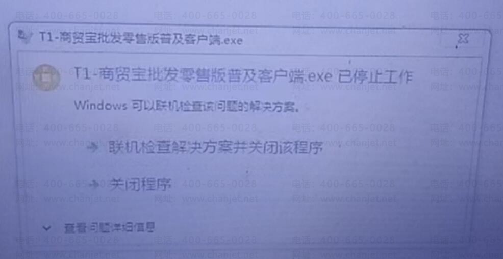 错误有如下两个,一个是“T1-商贸宝批发零售版普及客户端.exe 已停止工作”另外一个是“Excepton EAccessViolation in module T1-商贸宝批发零售版营及客户端.exe at 0002D790.Access violation at address 0042D790 in module 'T1-商贸宝批发零售版普及客户端.exe'Read of address 00000004.”如下面两张图所示