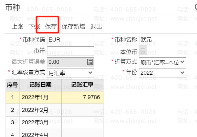 四、外币币种设置完毕后,点击菜单栏【保存】按钮,退出在外币列表中可显示新增的外币信息。