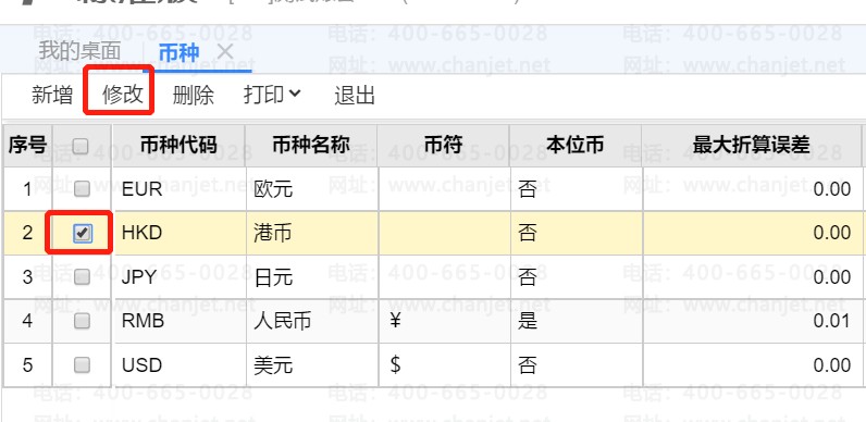 五、若币种信息有误需要修改,勾选外币,点击菜单栏上【修改】按钮,修改完毕后重新保存即可。