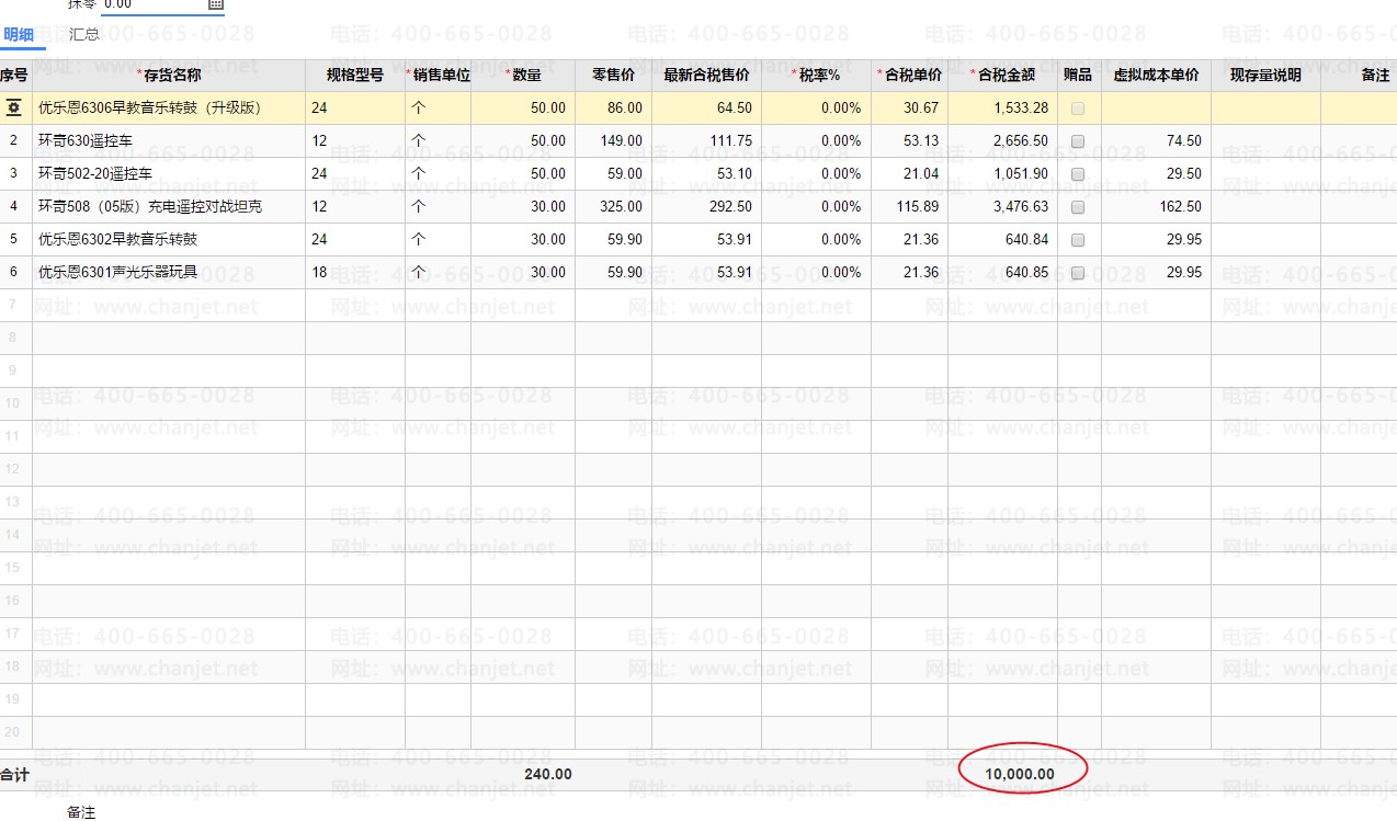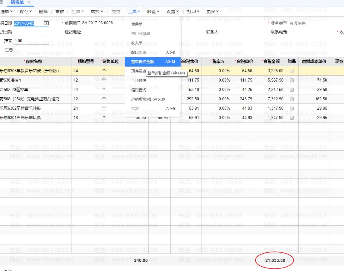 畅捷通T+可以实现整单金额打折.优惠的金额可以平均分摊到每个存货里面。