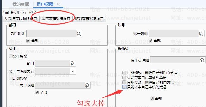 依次点击【系统管理】-【用户权限】-选中需要进行弃审操作的用户,可以是具体的【独立用户】或者组下面的具体用户-点击【用户授权】-【公共数据权限设置】页签-【操作员】中,根据取消或勾选【只能弃审自己审核的凭证】,如果勾选,则表示当前用户只能弃审自己审核的凭证,如果不勾选,则表示当前用户可以弃审别人审核的凭证。