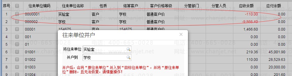 点击【往来单位】——点击表头工具栏【并户】——选中您所需要合并的单位确定后,如下图,此往来款等,会直接合并相加取总数。