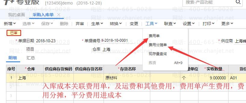 畅捷通T+在入库是可能会涉及到费用或其他支出,这里我们可以直接在入库单上直接生成相关的费用单,然后分摊直接平均到存货入库成本里面,