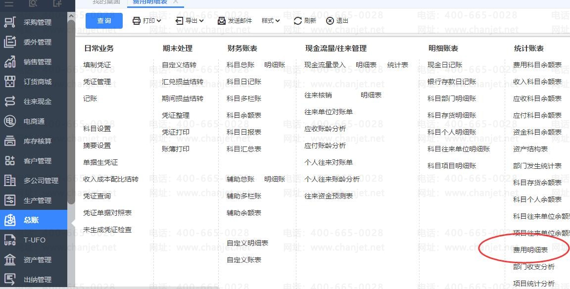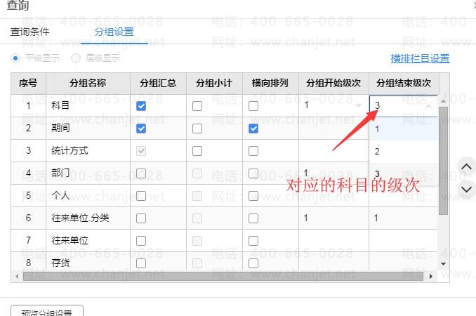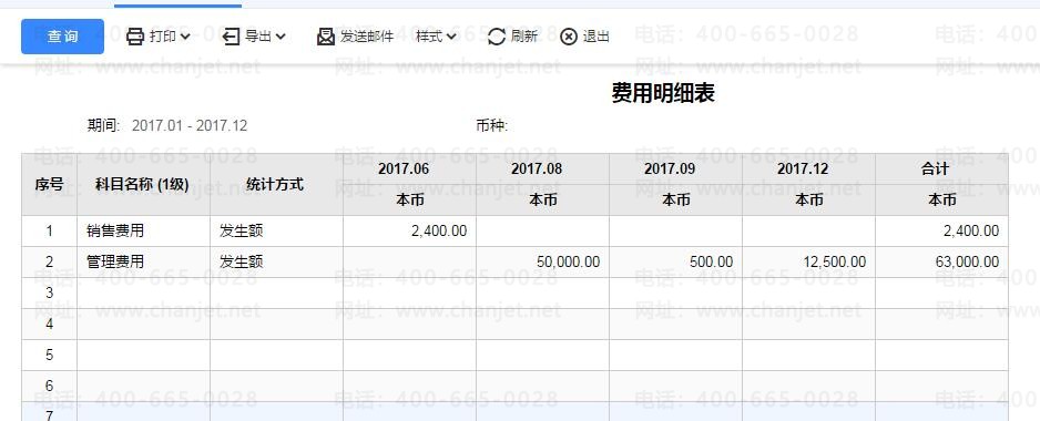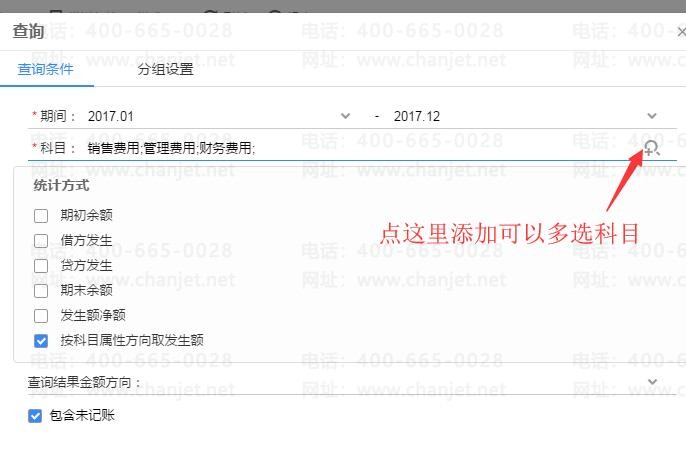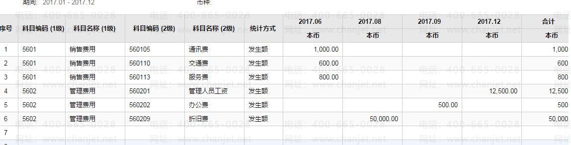 这样就可以带出您需要查询的科目,查询期间的全部发生额,如果您需要显示到末级科目