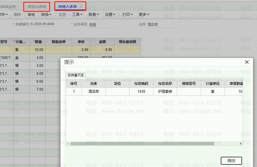 T+专属云其他入库单,其他出库单提示现存量不足是什么情况