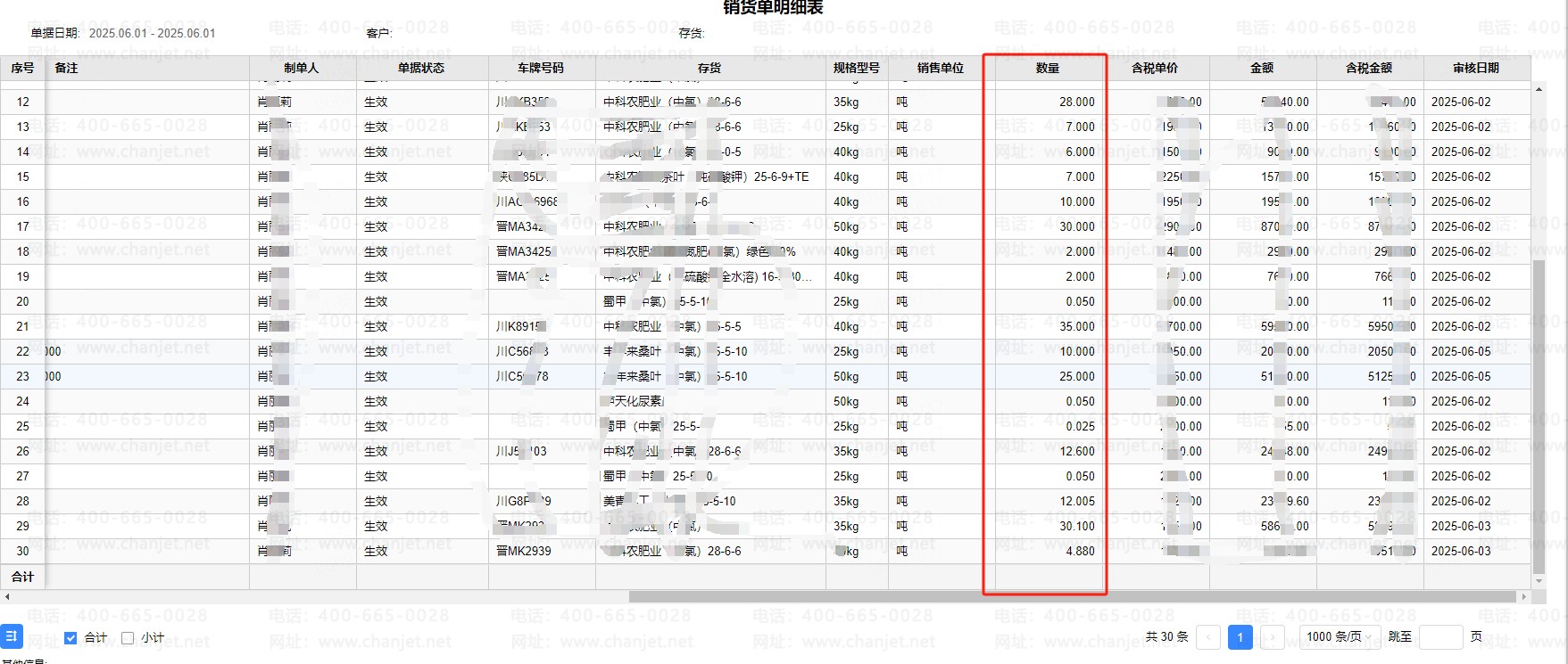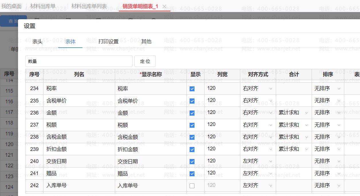 目前销货单明细表右上角设置中可以对某些字段设置合计,