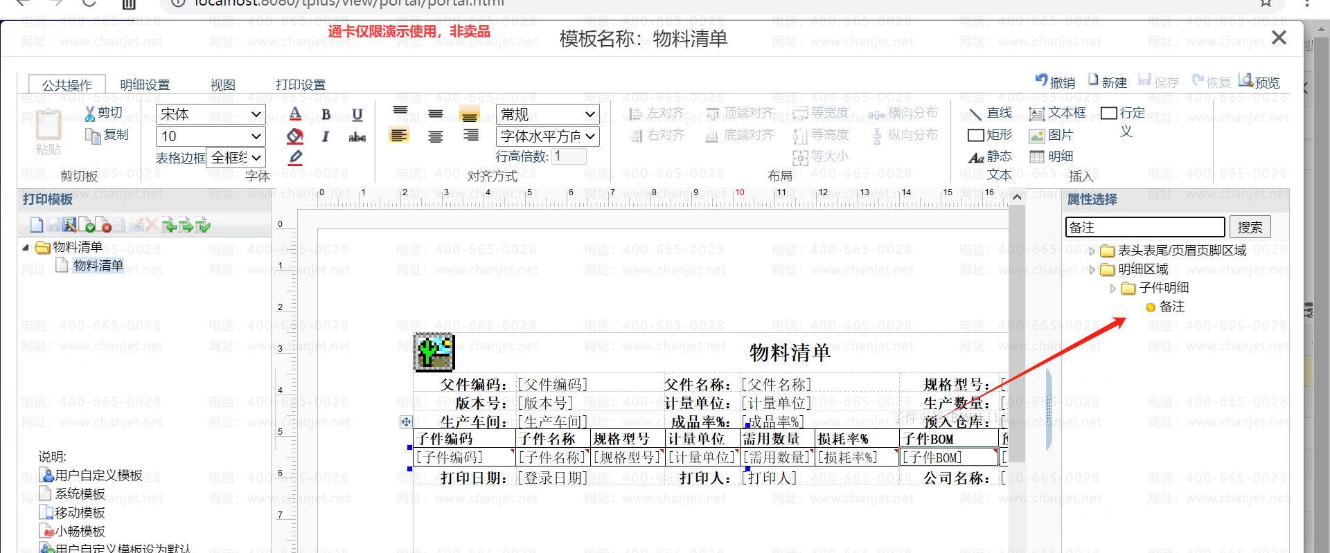 物料清单详情里可以设置打印模板,把需要显示的字段加到打印模板里