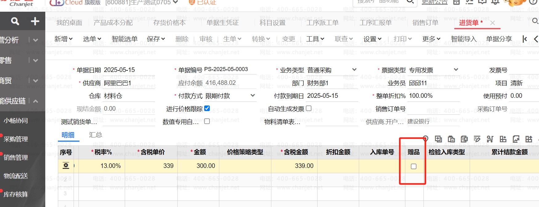可以在进货单上勾选赠品