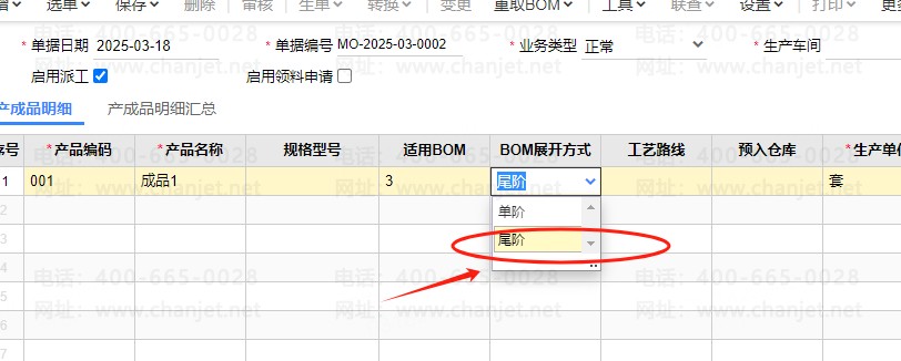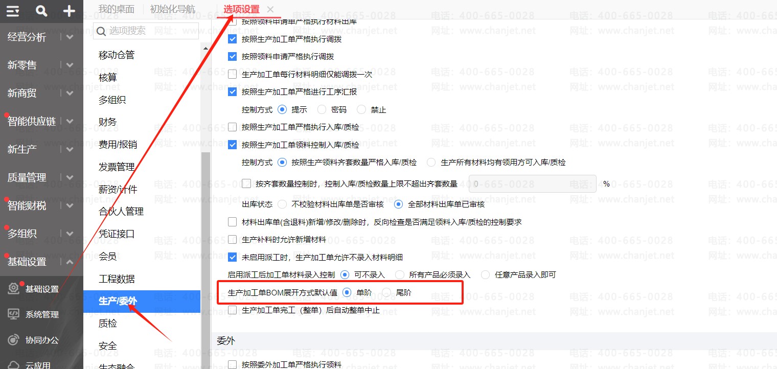 可以在系统管理-选项设置-生产/委外中设置生产加工单BOM展开方式默认值为尾阶