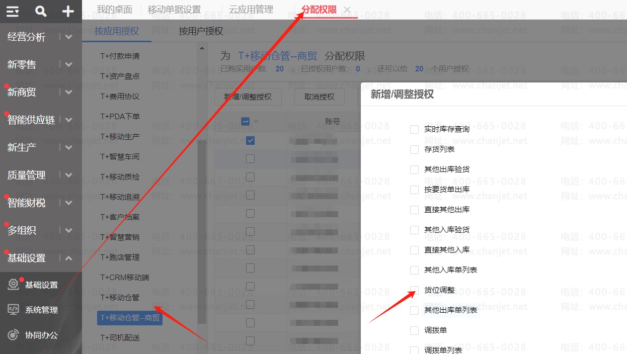 可以在云应用--云应用管理点击移动仓管应用后的授权按钮给对应授权货位调整的权限