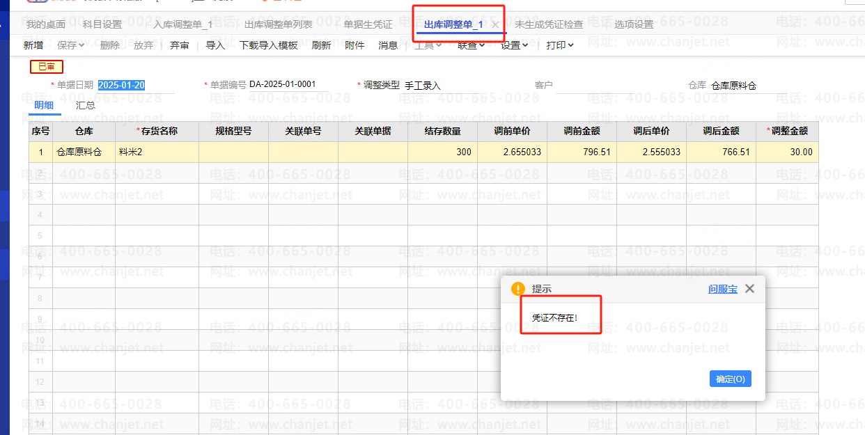 T+专属云,出库调整单无法生成凭证