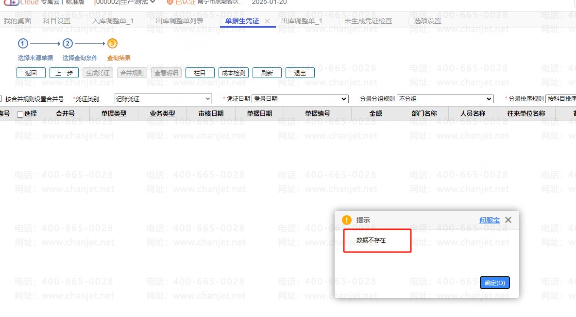 看调整单的单据日期是25年1月,单据生凭证第二步筛选的时候日期是不是选择的对应的日期呢,以及其他条件也检查一下。