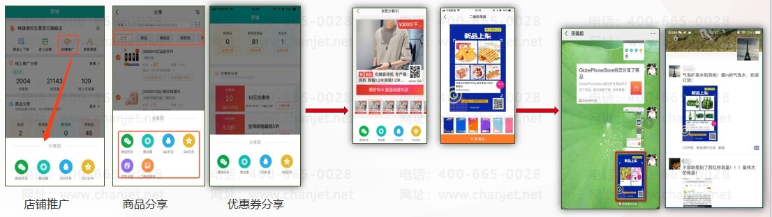 商品分享,商家可以根据近期的市场情况,多种形式多种通路分享商品,进而提升销量;商品多图、二维码海报分享更直观吸引客户;