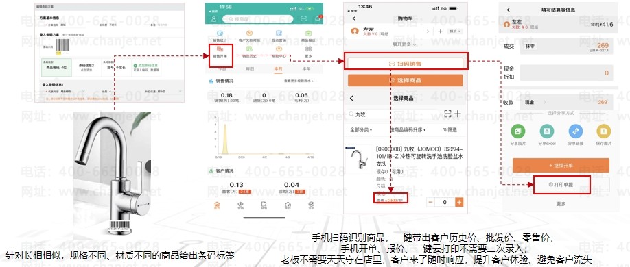 痛点: 4000多种商品都没有条码长相相似,规格、材质、价格不同,客户来了只能老板、老板娘负责接待介绍产品、手写下单后在给文员录入电脑进行开单;老板、老板娘一出门,门店一个电话接一个电话的询问商品、价格,客户体验差、文员接待效率低。