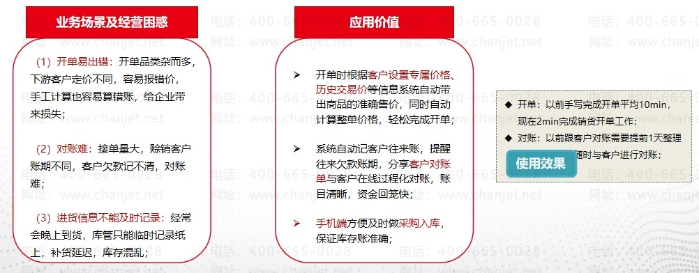 客户应用场景:价格自动化、收入有保障,往来对账准、资金风险低,采购管理更高效