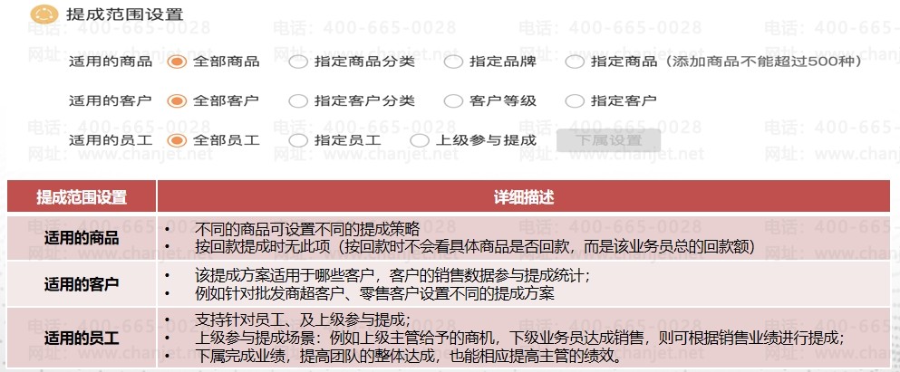 不同的提成方案适用的商品不同,哪些品牌货品类的商品适用该提成方案,如何设置?不同的提成方案适用的客户不同、适用的员工不同,如何设定提成范围?