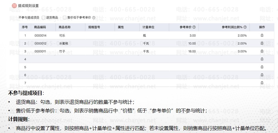 适用于流通快,未及时录入进货数据或给业务员设置一个考核成本,高于考核成本的都算业务员自己的提成业绩。