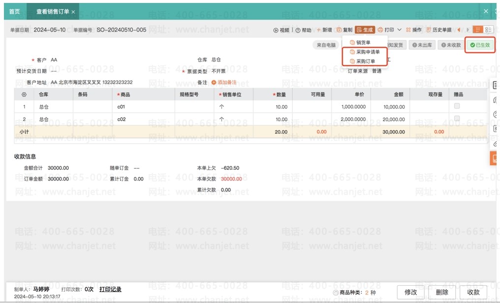 根据客户订货情况一对一生单:客户订货后,生效的销售订单可直接生成【采购申请单】【采购订单】