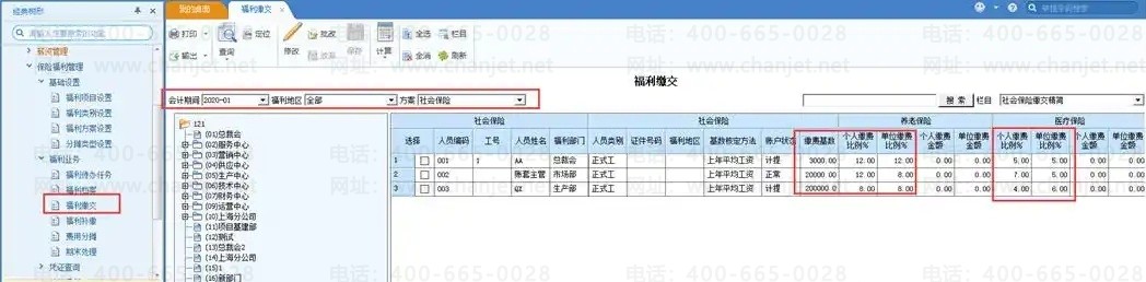 1、【福利业务】-【福利缴交】,选择对应的会计期间、福利地区和福利方案,系统自动带出福利档案里的缴费基数和缴费比例