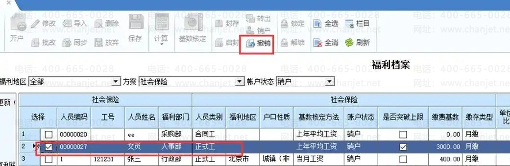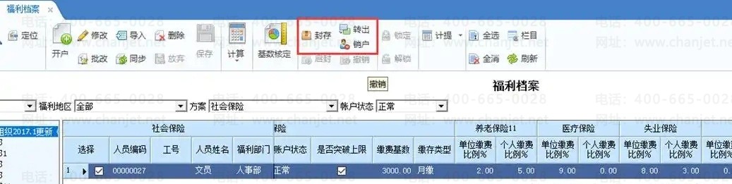 注意: 当月进行员工转出或销户操作,可以进行撤销。选择转出或销户的账户状态,点击【撤销】,完成转出或销户的反操作,个人账户恢复为正常状态。
