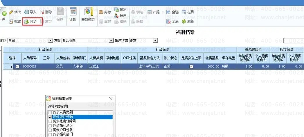 8. 如果人员档案修改了内容,此时需要同步的信息范围,可点击【同步】按钮,同步内容包括人员类别、证件号码、社会保障号、福利地区、户口性质、福利部门。