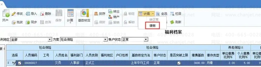 7. 如果人员需要当月需要缓缴保险,则可以点击计提-缓缴。