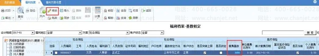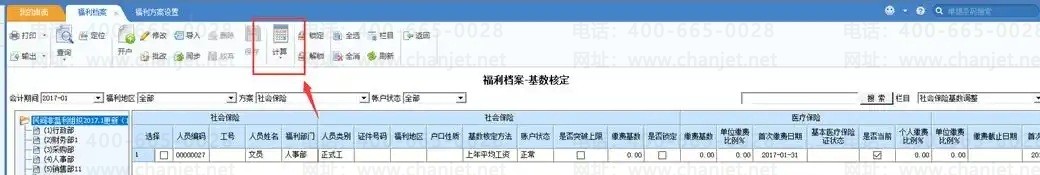 如果没有在福利方案中定义基数核定方法,那么点计算无效,需要点击修改,手工录入缴费基数。