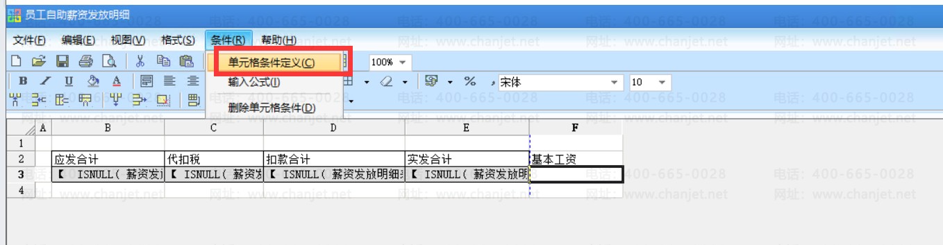 2、录入需要查询的工资项目,点击“条件-单元条件定义”,设置公式