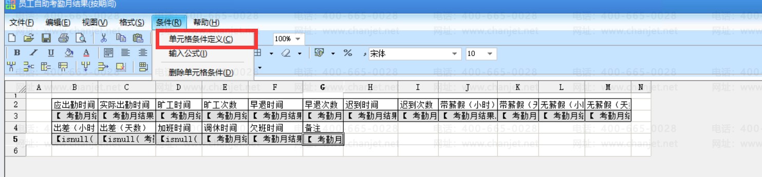 2、录入需要查询的考勤项目,点击“条件-单元条件定义”,设置公式