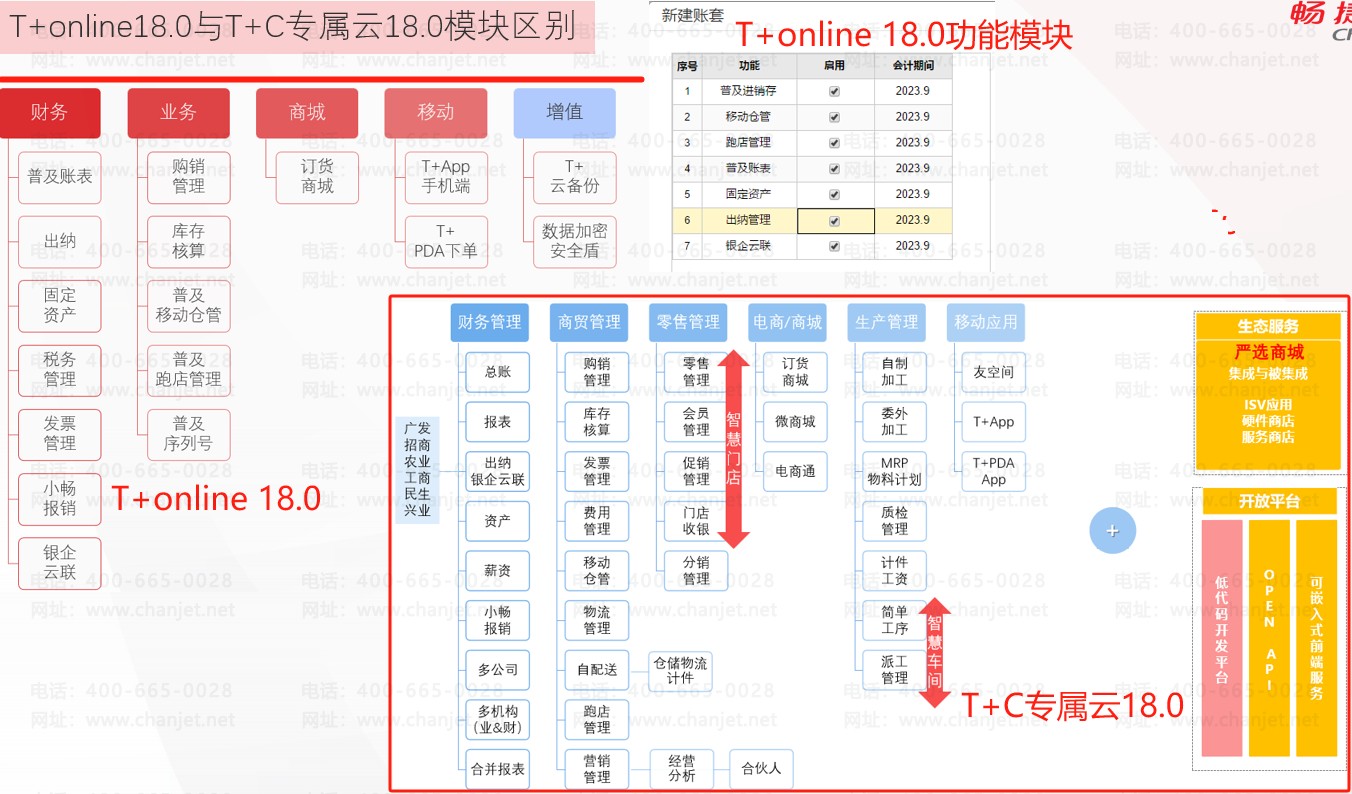 T+c专属云18.0功能强大,通用多种企业、财务管理(多机构)、商贸管理、零售管理、电商/商城、生产管理、移动应用、严选商场(已开发好的增值功能)、低代码二次开发等等(T+online有的功能,T+c专属云都包含有)