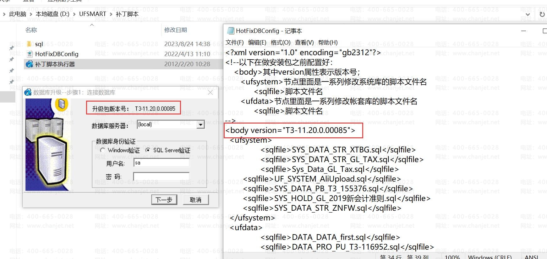 主要是“X:\UFSMART\补丁脚本\HotFixDBConfig.xml与补丁脚本执行器”里查询一下相关的版本,如下图所示